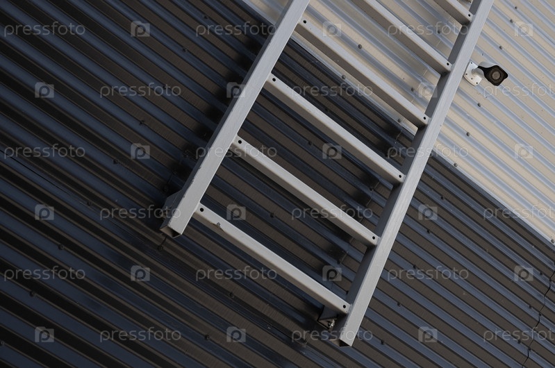 Крупный план металлической лестницы и камеры наблюдения на стыке черно-белой гофрированной стены
