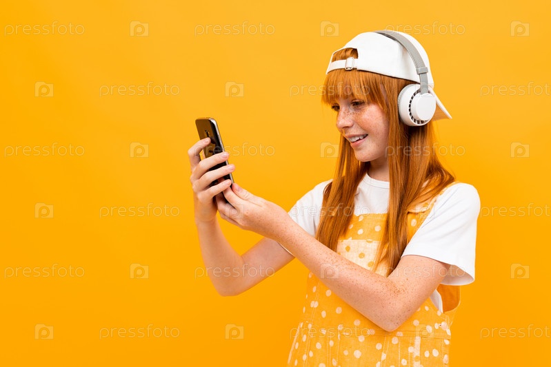 Улыбающаяся европейская рыжеволосая девушка в красных наушниках делает селфи на желтом фоне