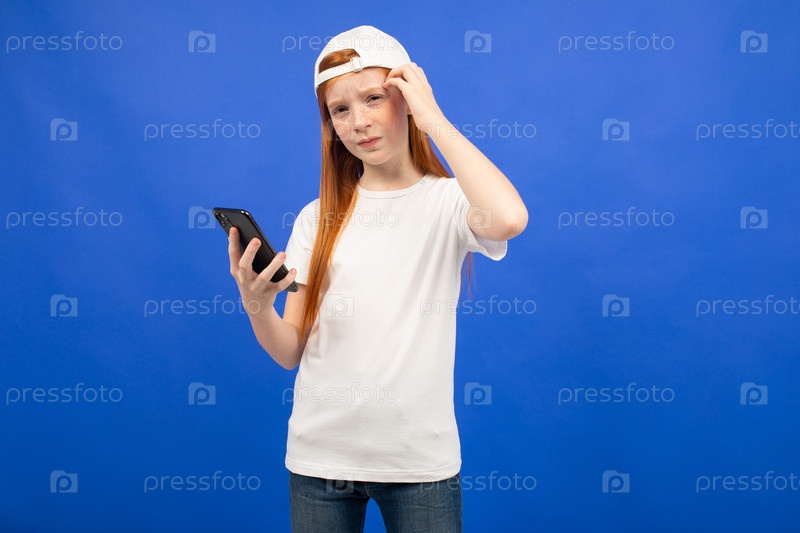 Рыжеволосая девушка-подросток в белой футболке с телефонами задумчиво держит смартфон в руке на синем фоне студии