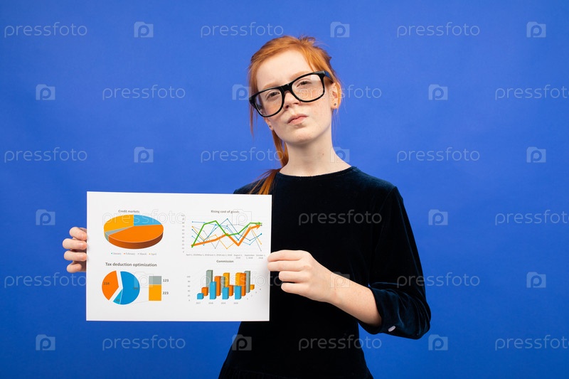 Умная девочка-подросток в очках и черном платье показывает статистику по диаграммам на синем фоне