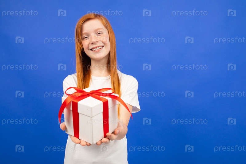Рыжеволосая девушка-подросток протягивает подарочную коробку на синем фоне студии с копией пространства