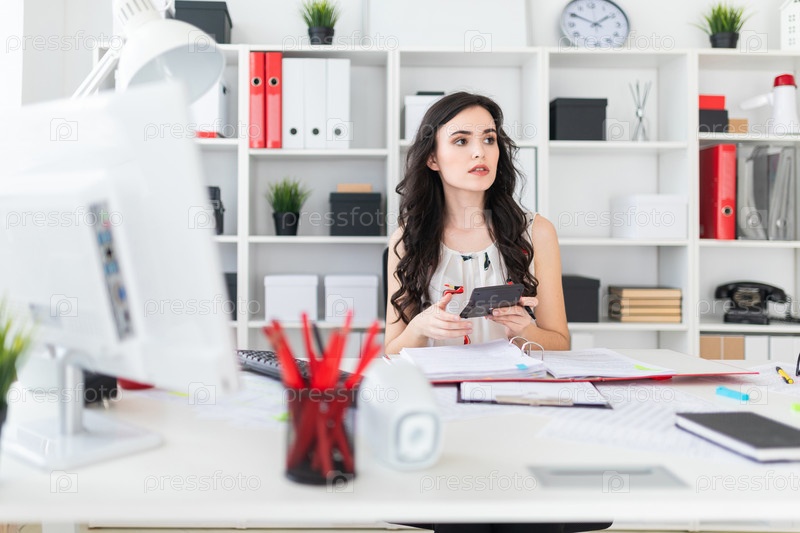 Красивая молодая девушка сидит за офисным столом и держит в руках ручку и калькулятор