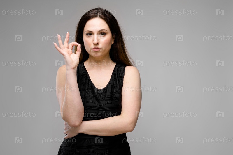 Эмоциональная довольно серьезная грустная модель плюс-size, стоящая в студии и показывающая хороший жест на сером фоне