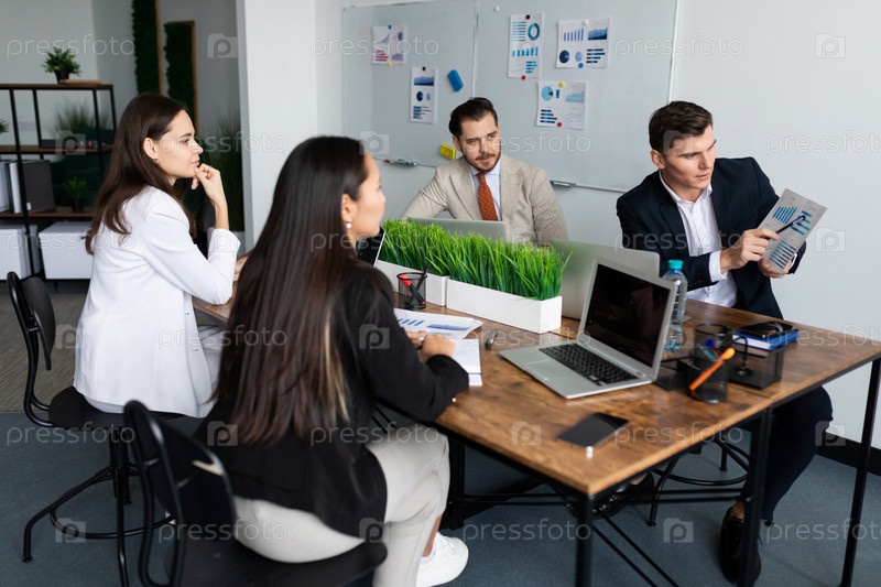 Переговоры молодых многонациональных бизнесменов за большим рабочим столом