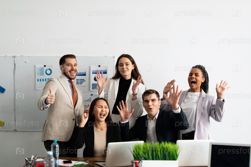 Группа коллег-бизнесменов, стоящих в офисе за ноутбуками с улыбкой, улыбающейся в камеру