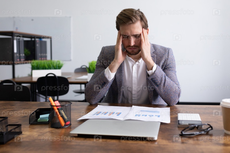 Усталый кавказский бизнесмен сидит перед документами в офисе и массирует виски