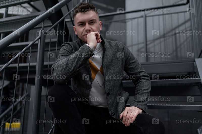 Сильный молодой человек в осеннем пальто сидит на металлической лестнице и смотрит в камеру