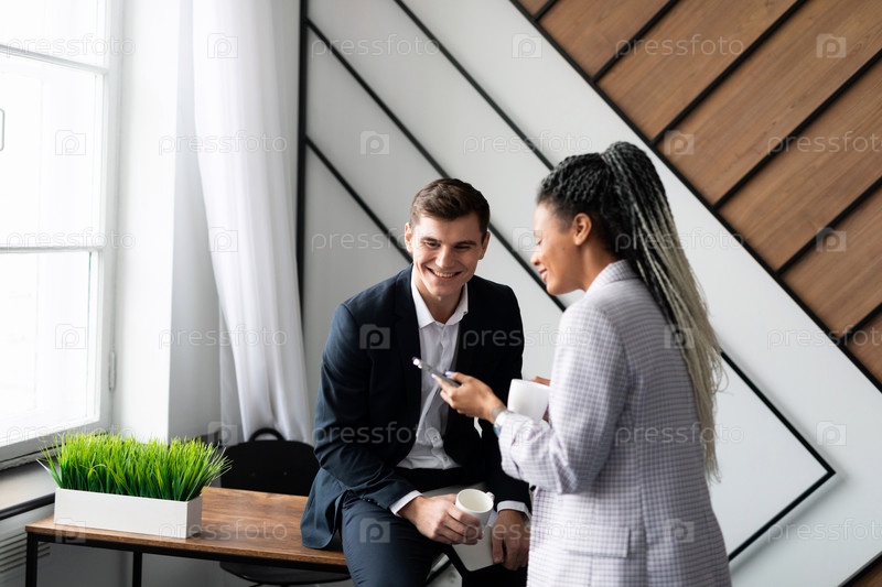 Неформальное общение коллег в офисе с телефонами в руках