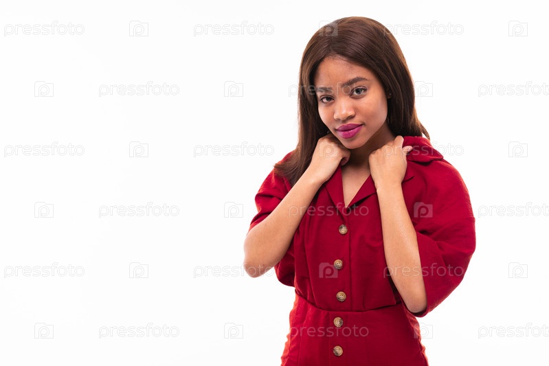 Портрет выразительной красивой афроамериканской девушки, позирующей на заднем плане