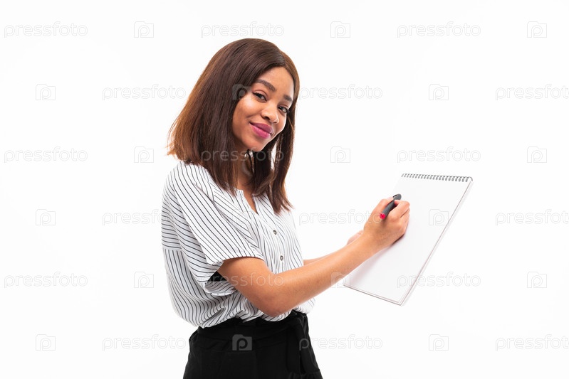 Улыбающаяся афроамериканская молодая девушка в повседневной одежде представляет что-то за плоским столом, изолированным на фоне макета