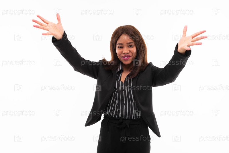 Экспрессивный темнокожий молодой улыбающийся и жестикулирующий на белом фоне
