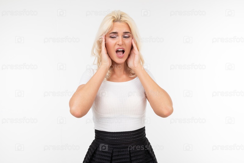 Блондинка в белой майке закрыла глаза и закрыла уши из-за шума на белом чистом фоне