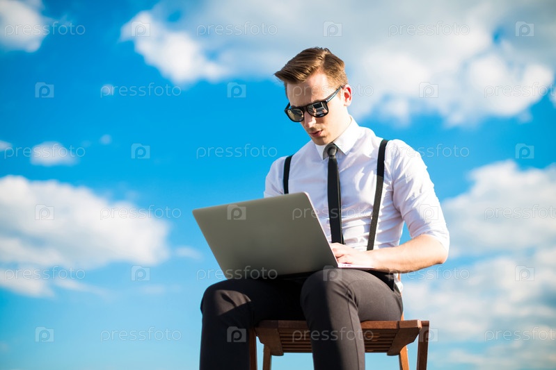 Привлекательный брюнет кавказский бизнесмен в белой рубашке, черном галстуке, черных подтяжках, черных брюках, дорогих часах и черных солнцезащитных очках сидит на стуле на крыше, работает с черным ноутбуком, постукивая по облакам на заднем плане