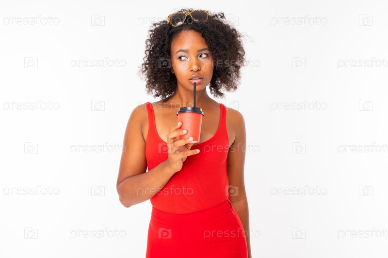 Африканская девушка в красной одежде пьет кофе из чашки с соломинкой на белом фоне