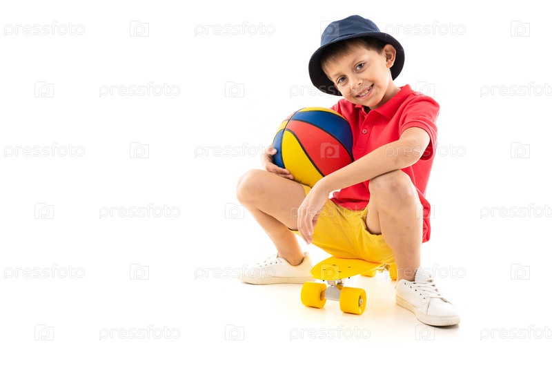 Кавказский подросток сидит на желтом пенни с мячом и улыбается
