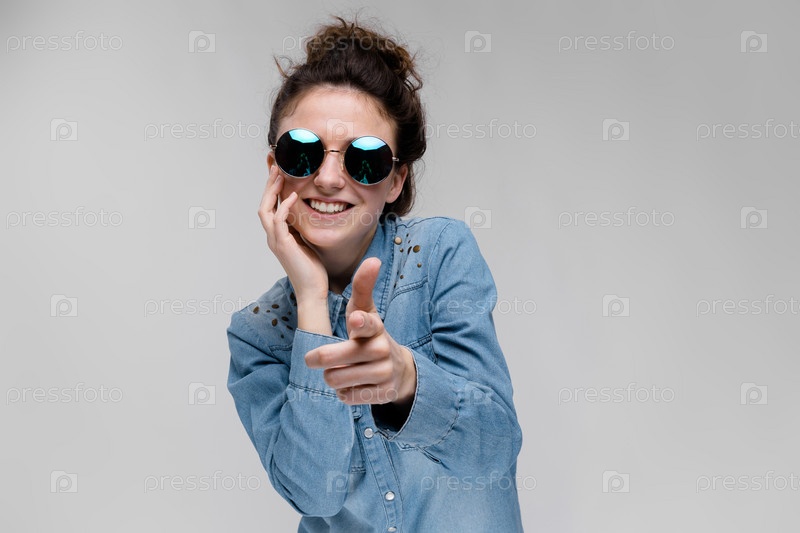 Молодая брюнетка в круглых очках. Волосы собраны в пучок. Девушка показывает пальцами