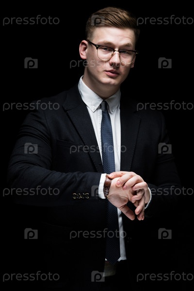 Портрет уверенного в себе красивого амбициозного счастливого элегантного ответственного бизнесмена с рукой на черном фоне