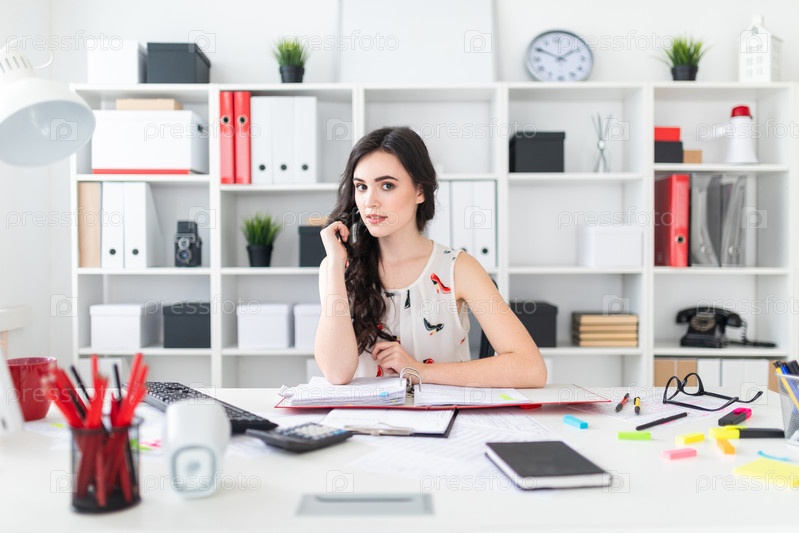 Красивая молодая девушка сидит за офисным столом, держит волосы в руке и смотрит прямо