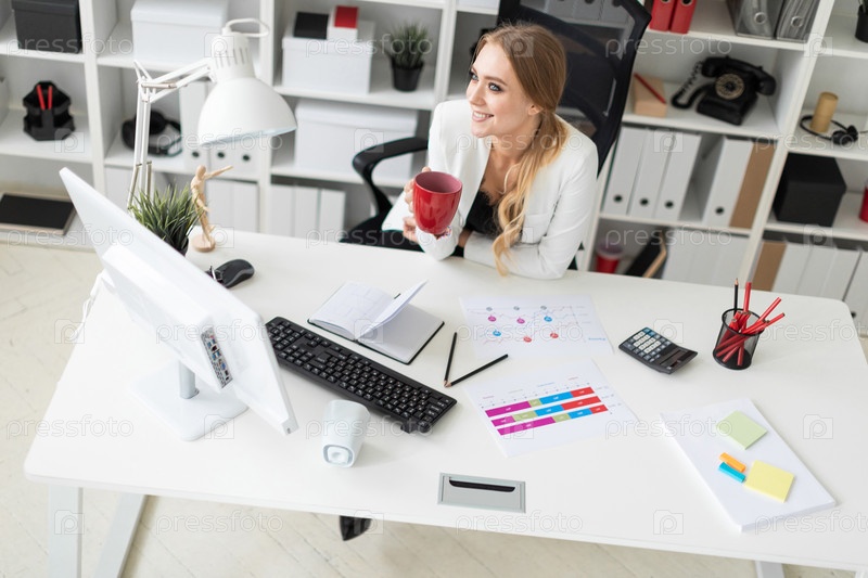 Молодая девушка сидит за компьютерным столом в офисе и держит чашку. Перед девушкой на столе лежат схемы