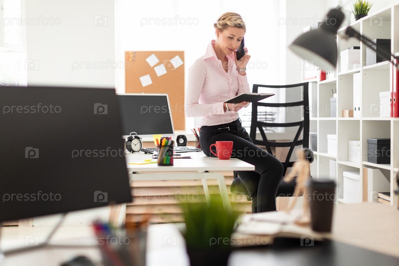 Молодая блондинка присела на стол в офисе, разговаривая по телефону и держа в руке блокнот
