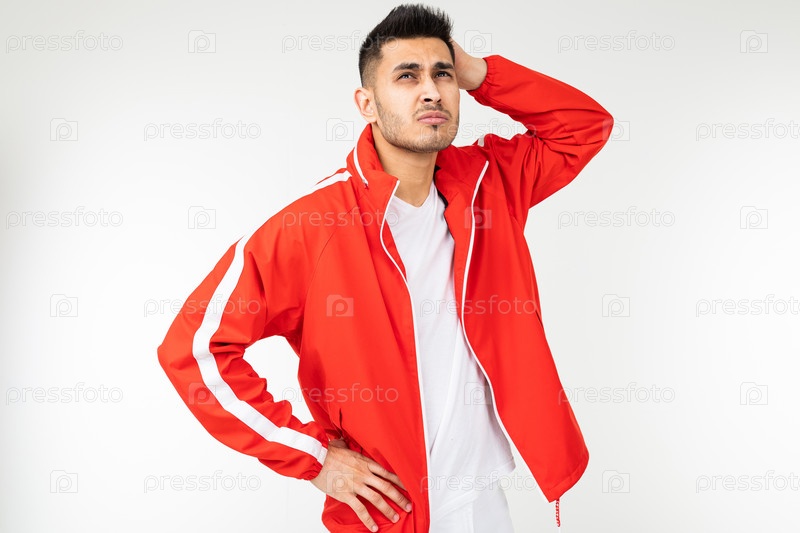 Сильный мужчина в спортивном красном костюме отражается на белом фоне с копией пространства