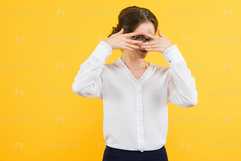 Портрет уверенной в себе красивой молодой деловой женщины, закрывающей глаза руками на желтом фоне