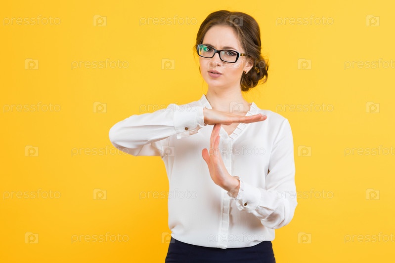 Портрет уверенной в себе красивой молодой серьезной элегантной деловой женщины со знаком тайм-аута на желтом фоне
