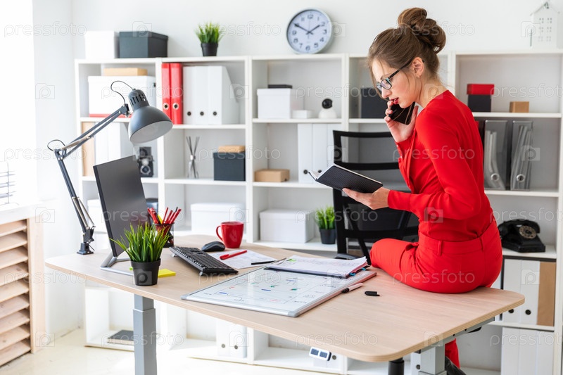 Молодая девушка села на стол в своем кабинете, держала в руках блокнот и разговаривала по телефону
