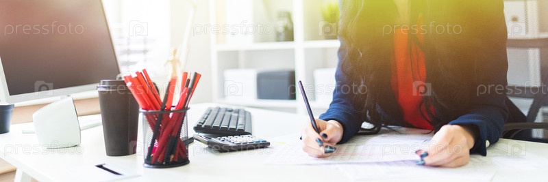 Красивая молодая девушка работает с документами в офисе за столом и держит в руке карандаш