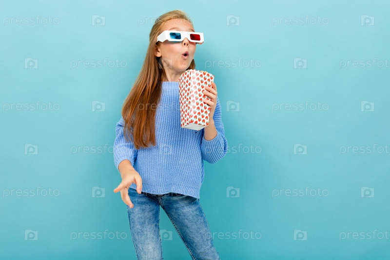 Девушка с макияжем и длинными коричневыми волосами, 3D-очками смотрит фильм или мультфильм с попкорном