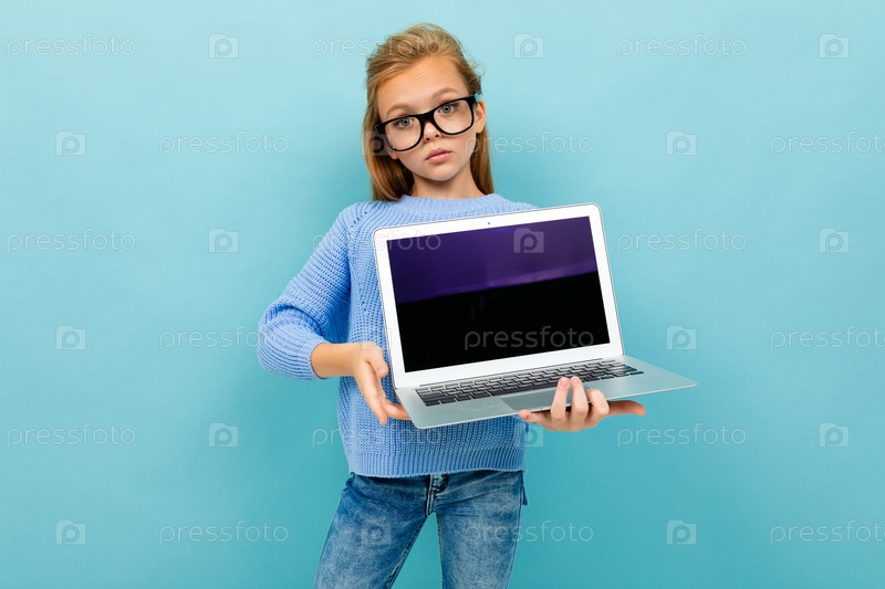 Серьезная стильная школьница в очках с ноутбуком на фоне синей стены