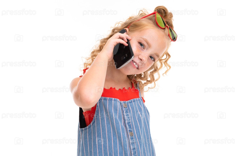 Молодая очаровательная девочка разговаривает по телефону на белом фоне
