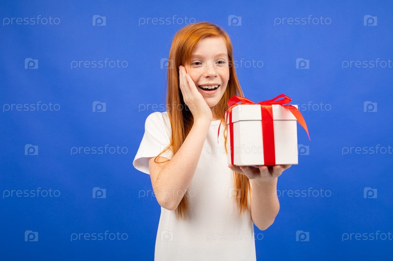 Счастливая девочка-подросток с рыжими волосами получила подарок на день рождения на синем фоне студии