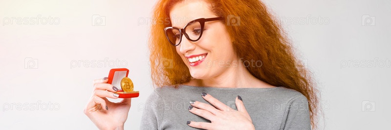 Портрет красивой рыжеволосой счастливой улыбающейся молодой женщины в серой одежде в очках, смотрящей на биткойн как на концепцию криптовалюты