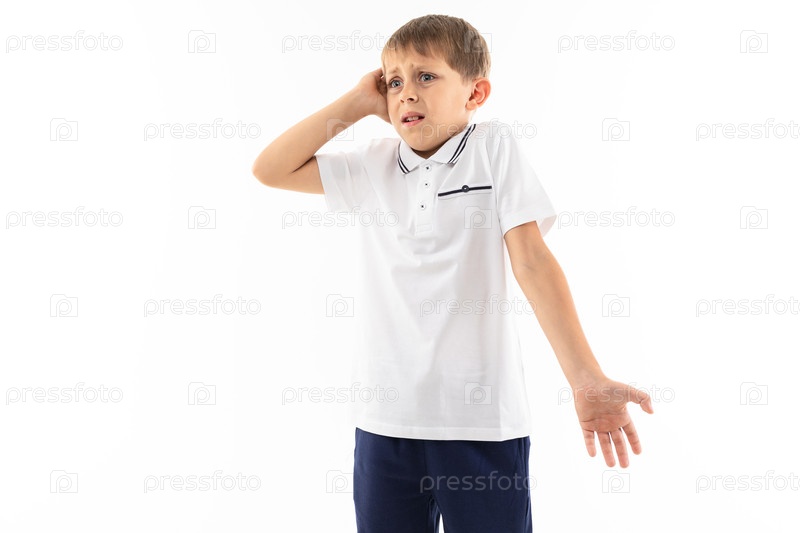 Маленький мальчик в белой рубашке, синих шортах со светлыми волосами стоит и удивлен