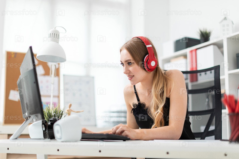 Молодая девушка в наушниках сидит за столом в офисе и печатает на клавиатуре