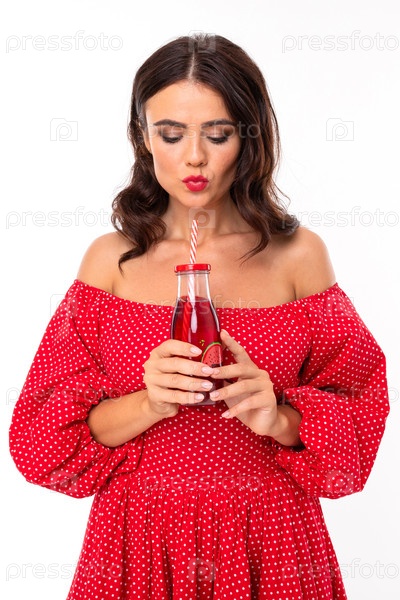 Портрет молодой брюнетки с красным напитком в руках, белый изолированный фон