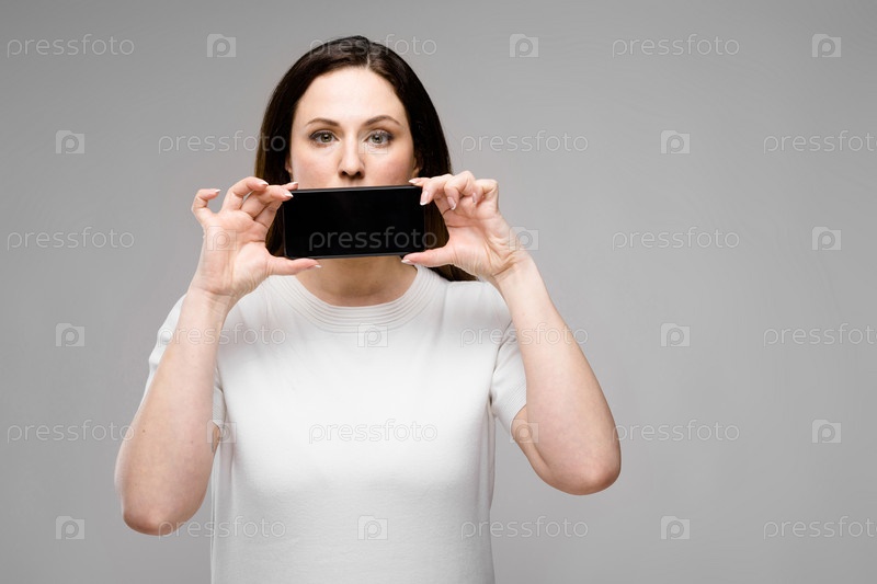 Поясный портрет привлекательной женщины больших размеров в белой футболке, закрывающей рот мобильным телефоном, изолирован на сером фоне с концепцией цифровой рекламы copyspace