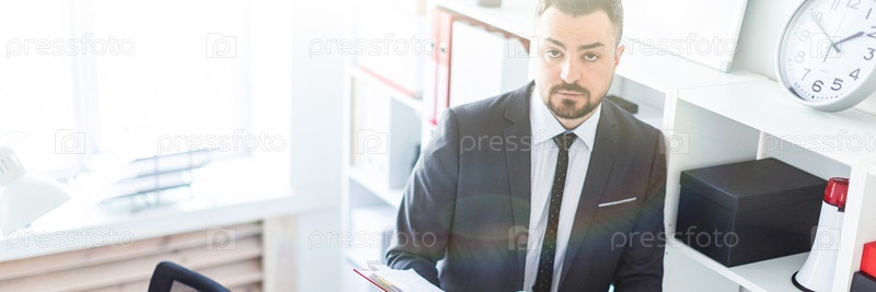 Мужчина стоит возле стеллажа в офисе и листает папку с документами