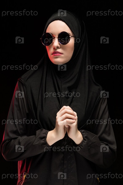 Портрет красивой стильной молодой мусульманки в черном хиджабе и солнцезащитных очках как концепция современной восточной моды на черном фоне