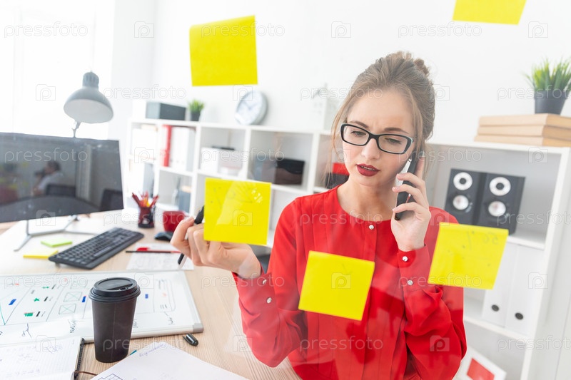 Красивая молодая девушка в очках и красной рубашке работает в офисе. фото с глубиной резкости