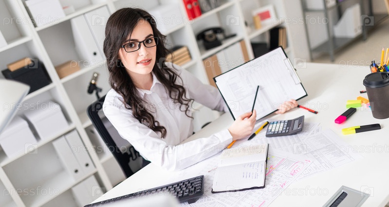 Очаровательная молодая девушка работает в светлом офисе. фото с глубиной резкости