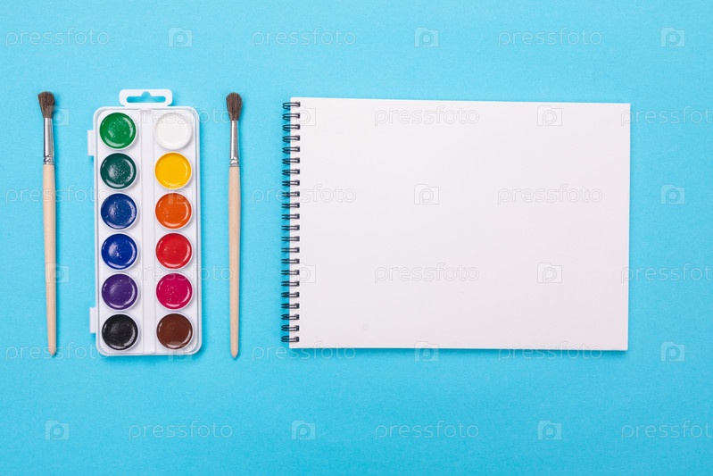 Акварельные краски и кисть с альбомом для рисования, изолированные на синем фоне