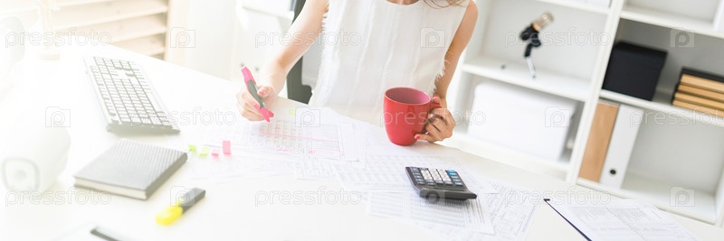 Очаровательная молодая девушка в очках и белой блузке сидит в офисе за компьютерным столом. фото с глубиной резкости