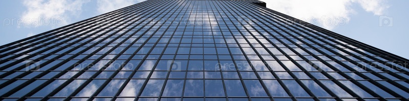 Панорама высокого стеклянного здания, отражающего небо с облаками