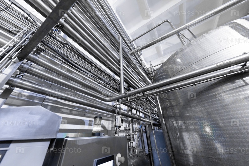 Промышленный фон. Оборудование, промышленные инструменты и машины для производства в заводских цехах. молочный завод. Стальной водопровод, хромированные трубы. Внутри современного винного завода. Современный заводской интерьер