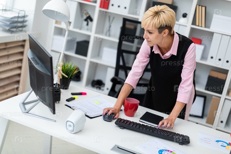 Молодая девушка стоит возле стола в офисе и печатает на клавиатуре