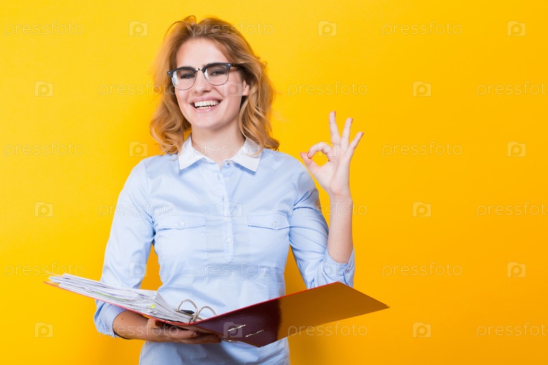 Привлекательная счастливая деловая женщина в синей рубашке и очках, изолированных на оранжевом фоне, держащая открытую большую папку с файлами и показывающая концепцию представления отчета о выпускном или курсовой работе