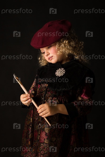 Вертикальное изображение, изолированное на черной, красивой кавказской блондинке в коричневом винтажном платье, красных колготках и берете, держит деревянную флейту