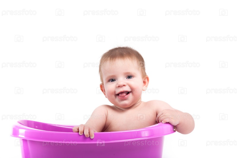 Изолированный на белом, милый счастливый кавказский мальчик принимает ванну в фиолетовой ванне, показывает язык, смотрит в камеру